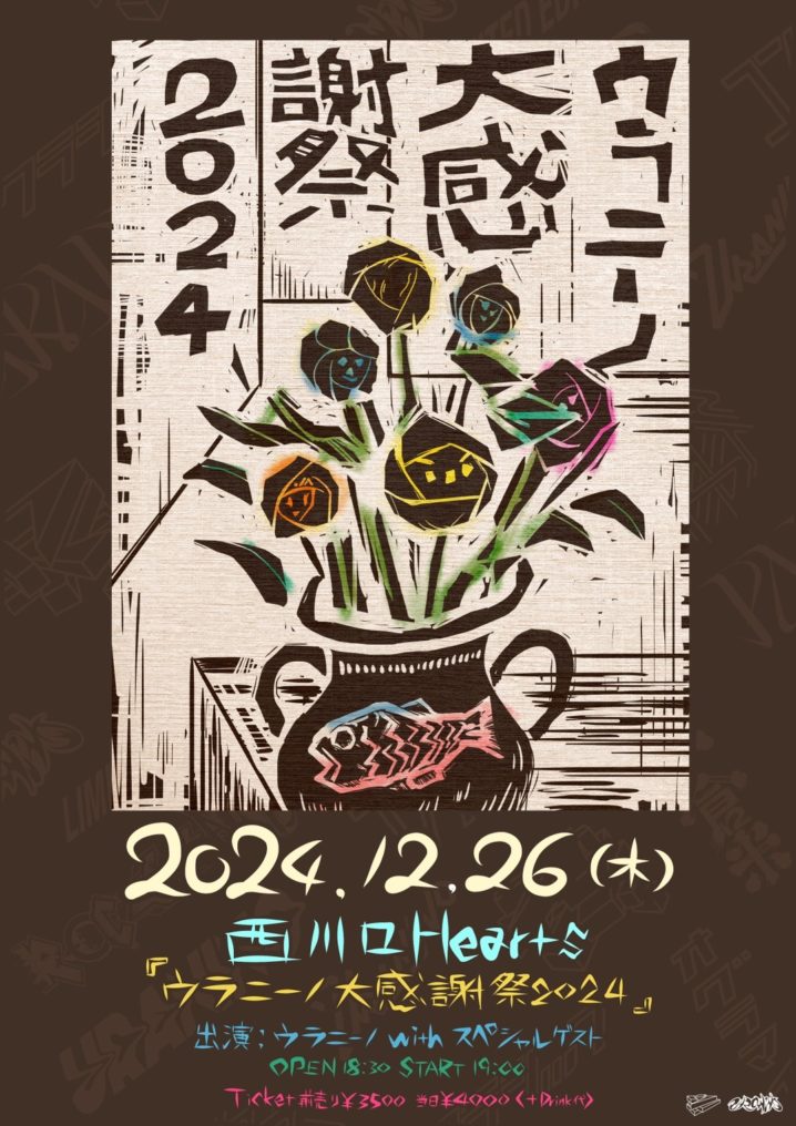 日時:2024年12月26日 会場:西川口ハーツ 出演:ウラニーノ with guest musicians open 18:30 start 19:00 前売り 3,500 当日 4,000