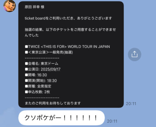 申し込んだTWICEのチケットの抽選結果が20時に出るので、研修生の大学生が「山岸さんのTWICE当落発表のタイミングで休憩取りましょう」と気を遣ってくれた。